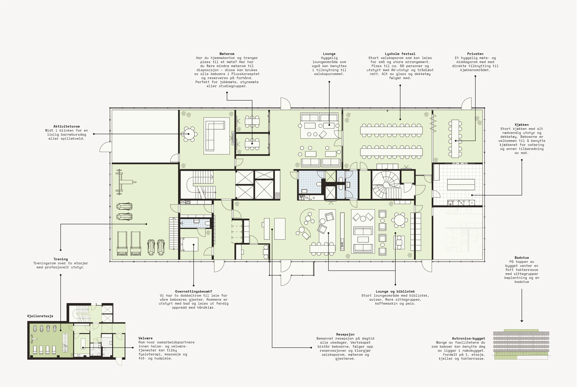 Ved å kombinere service og opplevelser legges forholdene til rette for en innholdsrik og bekymringsfri hverdag. Med Plusskonseptet får du noe av servicen fra et hotell, til daglig. Du har tilgang på et serviceområde med bemannet resepsjon, trivelig lobby, peisestue, bibliotek, gjesterom, treningsrom, møterom, selskapsrom og velutstyrt kjøkken, i tillegg til et grovkjøkken. Verten jobber i resepsjonen, holder orden på serviceområdet, organiserer alle tilbud, tilrettelegger og bistår med praktisk hjelp, både når det gjelder husholdning- og velværetjenester.