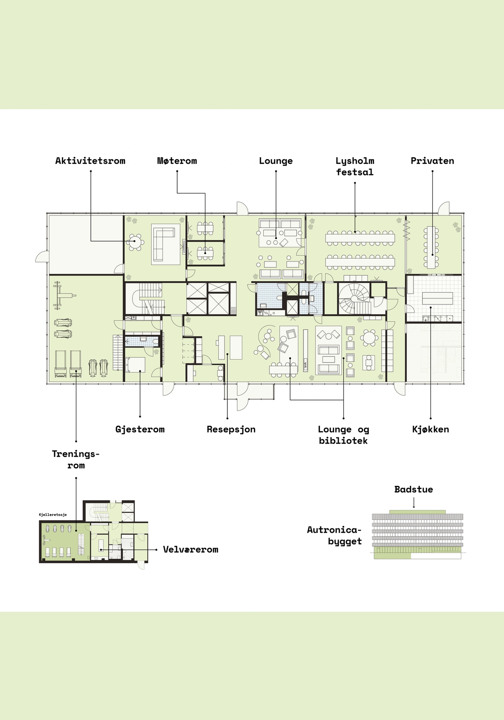 De felles fasilitetene ligger i det tidligere Autronica-bygget og er åpne for alle som bor i Lille Lade. Her finner du en hyggelig lounge for morgenkaffen med ferske aviser, moderne treningsrom, lyse møterom, selskapslokale og felleskjøkken for små og store sammenkomster. På taket venter en romslig terrasse med utsikt og en badstue som kan brukes året rundt. En dedikert vert sørger for orden, oversikt og trivsel i det daglige.